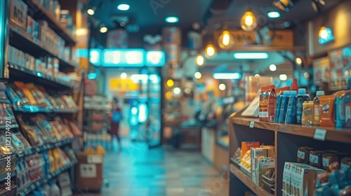Blurred view of a convenience store interior with shelves stocked with various goods and a customer in the background.
