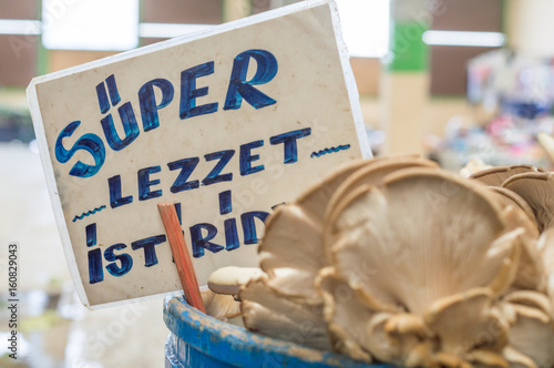 Blurry fresh oyster mushrooms with "Super Taste Oyster" tag behind on the counter in a typical greengrocery bazaar in Turkey.