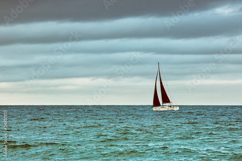 Boat with black sails on the sea in stormy weather