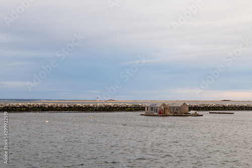 Boathouse and the Long Point Light Station in the distance panoramic view from MacMillan Wharf.