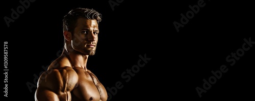 Bodybuilder stares intensely at the camera on a black background