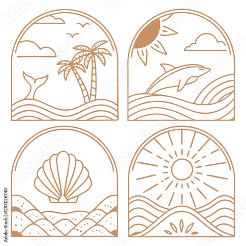 Bohemian Linear Logos and Icons with Ocean, Beach, and Surfing Elements
