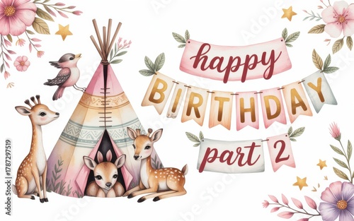 Boho birthday party elements with teepee deer and bird Keywords: birthday, party, boho, tribal