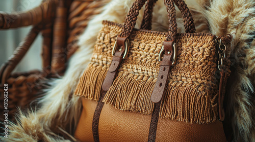 Boho-chic woven bag showcases earthy colors and intricate textures against natural backdrop