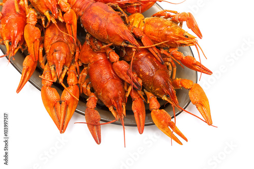 boiled crayfish on a plate on a white background