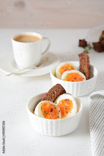 Boiled egg for breakfast. Cup of coffee.