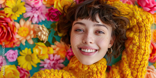 Bold and Bubbly: A vibrant teenage pinup girl wears a bright yellow sweater, a mischievous grin spreading across her face. She poses next to a cheerful flowered backdrop.