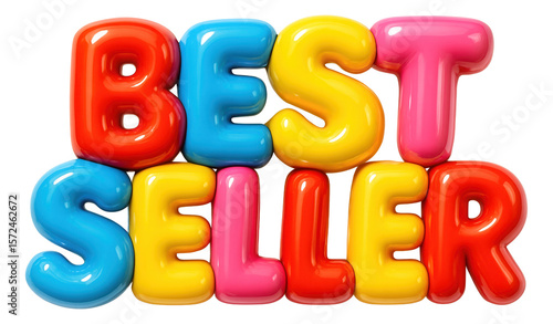 Bold bubble letters spelling BEST SELLER in glossy style, vibrant retail promo offer on transparent background.