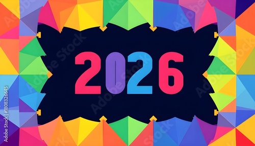 Bold multicolor “2026” centered on dark background with vibrant geometric border of triangles and polygons.