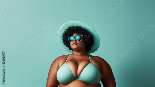 Bold plus-size woman in a matching aqua bikini, sunhat, and sunglasses stands against a teal backdrop, radiating confidence and cool.