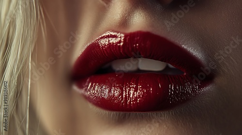 Bold Red Lipstick Close-up on Blonde Woman's Lips with Soft Lighting Accentuating Color and Texture
