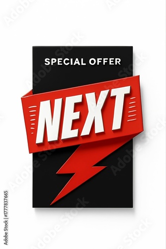 Bold red next text overlayed on a black square with a red lightning bolt and special offer text