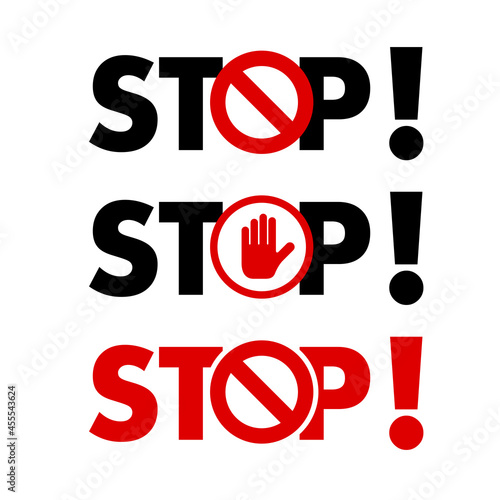 Bold STOP lettering with exclamation mark, stop hand and backslash sign. Vector illustration