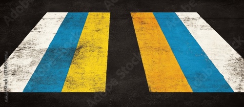 Bold, Worn Blue, Yellow, White Parallel Stripes on Textured Black Asphalt Road Marking