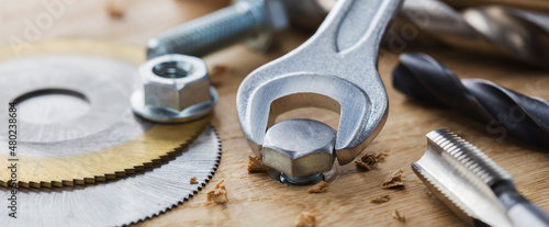 bolt screw by hex wrench in wooden oaks plate with with drill bit and circular saw