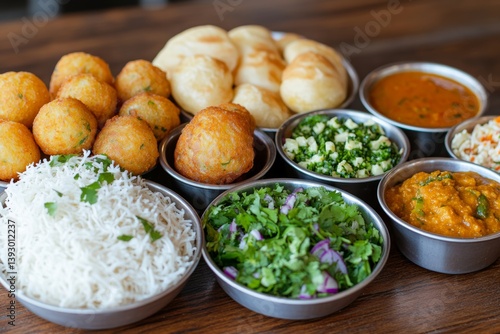 Bonda and variety of Indian food on wooden table. Bonda as deep-fried veg fritter served with rice, bread, salad. Concept of sharing vibrant Indian cuisine experience featuring Bonda.