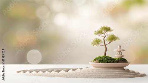 Bonsai tree with stone lantern on sand surface in serene environment