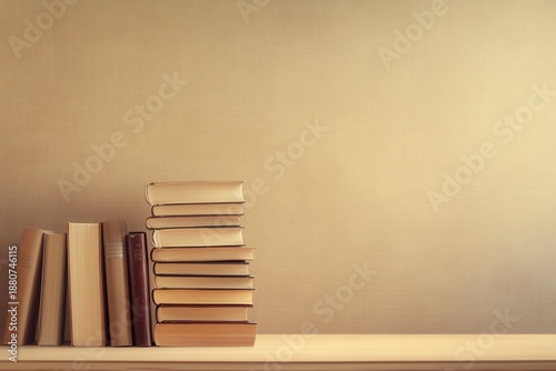Book stack on neutral background, Neutral beige surface featuring book pile and open space for text, Simple beige background showcasing book stack on side with room for branding or copy