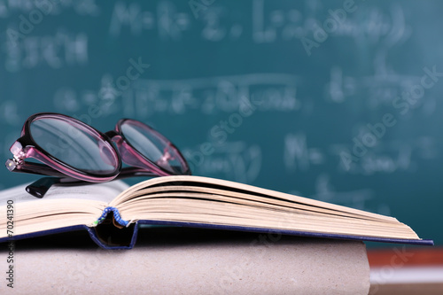 Books and glasses on blackboard background