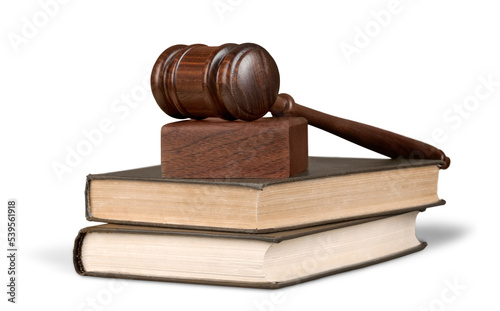 Books and wooden gavel on table. Justice concept