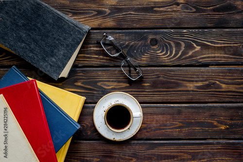 Books on library desk for reading, coffee, glasses on wooden background top view mockup