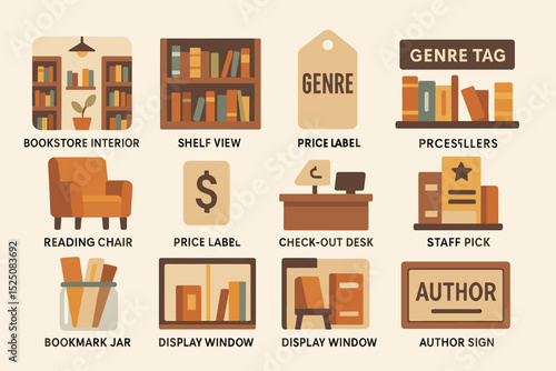 Bookstore elements: bookshelves, tags, and reading accessories icons