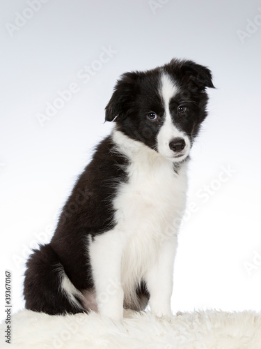 Border collie puppy portrait. Image taken in a studio. 10 weeks old puppy dog posing isolated on white. copy space.