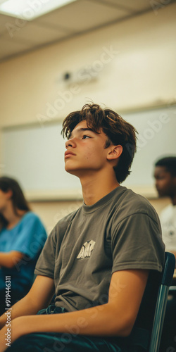 Bored teenager sitting in a dull classroom