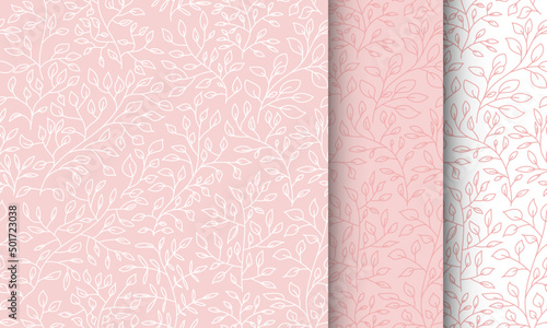 Botanic seamless pattern in pink and white colors. Endless background for linen, fabric, wallpaper, wrapping paper. Nice little leaves and tree branches.