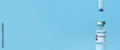 Bottle of Lenacapavir vaccine with syringe on blue background and copy space, illustrating HIV prevention and treatment through modern medicine, healthcare technology, and pharmaceutical innovation