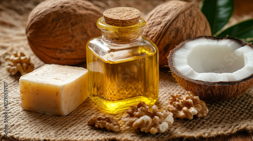 bottle of walnut oil beside soap bar and coconut, with walnuts scattered on textured surface. warm colors and natural elements create calming atmosphere