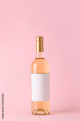 Bottle of wine with blank label on color background. Mockup for design