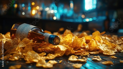 Bottled beverage amidst spread of crispy potato chips in bar setting. National Hangover Day