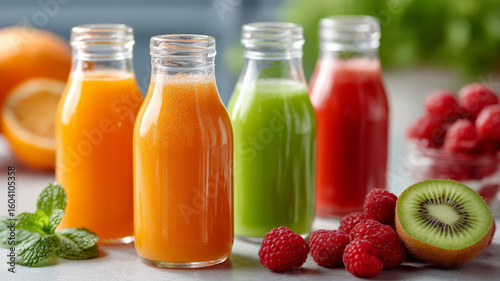 Bottles of colorful juice with fruits on a table.