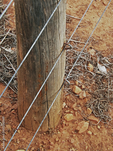 Bottom of timber fence post with wire with red soil and dead grass in background