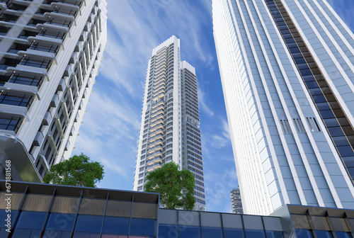 Bottom view of modern skyscrapers in business district, Business vision concept. 3D render