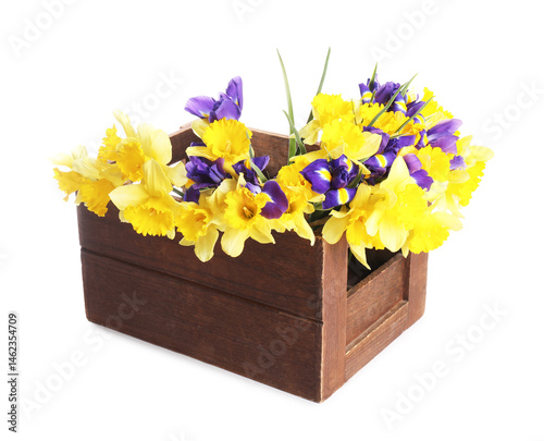 Bouquet of beautiful daffodils and irises in crate isolated on white