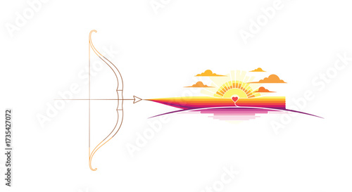 Bow and Arrow Aiming at a Fiery Sunset Landscape, Generative AI.