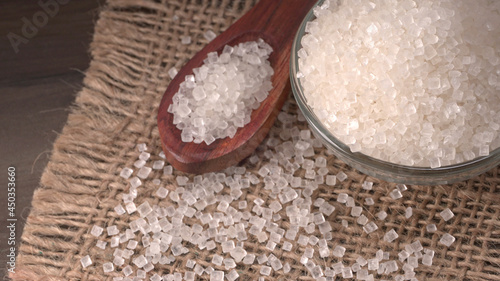 Bowl and spoon with sugar on wooden background.
