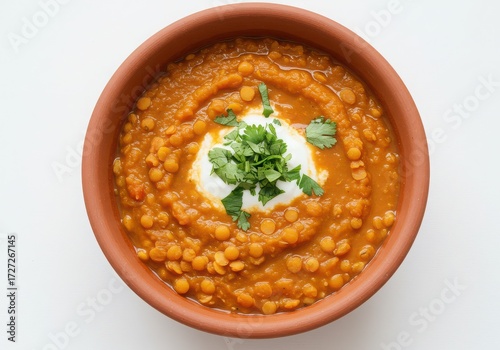 Bowl of lentil soup with yogurt and cilantro isolated on white background