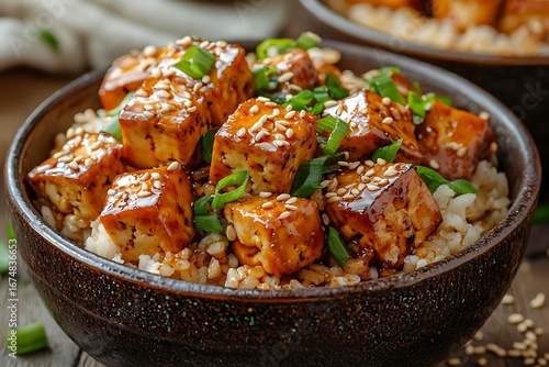 Bowl of red rice with spicy tofu cubes high resolution picture