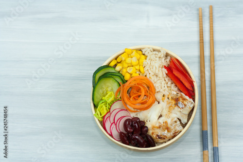 Bowl of vegetables, rice and fish. Healthy food concept.