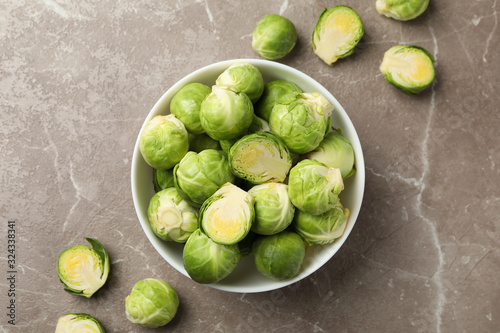 Bowl with brussels sprout on grey background, top view