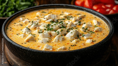 Bowl with chunks in creamy sauce, garnished with herbs