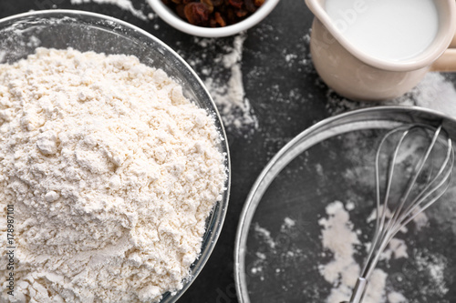 Bowl with flour on table