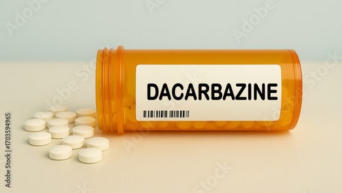 Box of DACARBAZINE tablets on a hospital pharmacy table used to treat melanoma and Hodgkin lymphoma an alkylating chemotherapy.