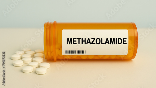 Box of METHAZOLAMIDE tablets on a hospital pharmacy table used to treat glaucoma a carbonic anhydrase inhibitor.