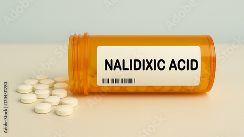 Box of NALIDIXIC ACID tablets on a hospital pharmacy table used to treat urinary tract infections a quinolone antibiotic.