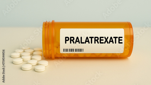 Box of PRALATREXATE tablets on a hospital pharmacy table used to treat peripheral T cell lymphoma an antifolate chemotherapy.