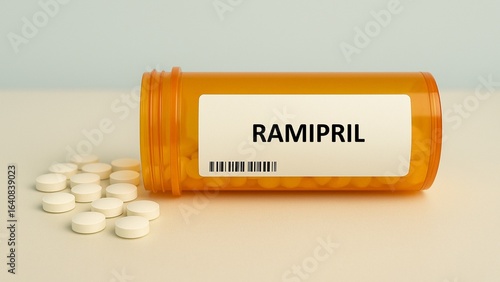 Box of RAMIPRIL tablets placed on a hospital pharmacy table used for symptom relief and therapy, a therapeutic agent.